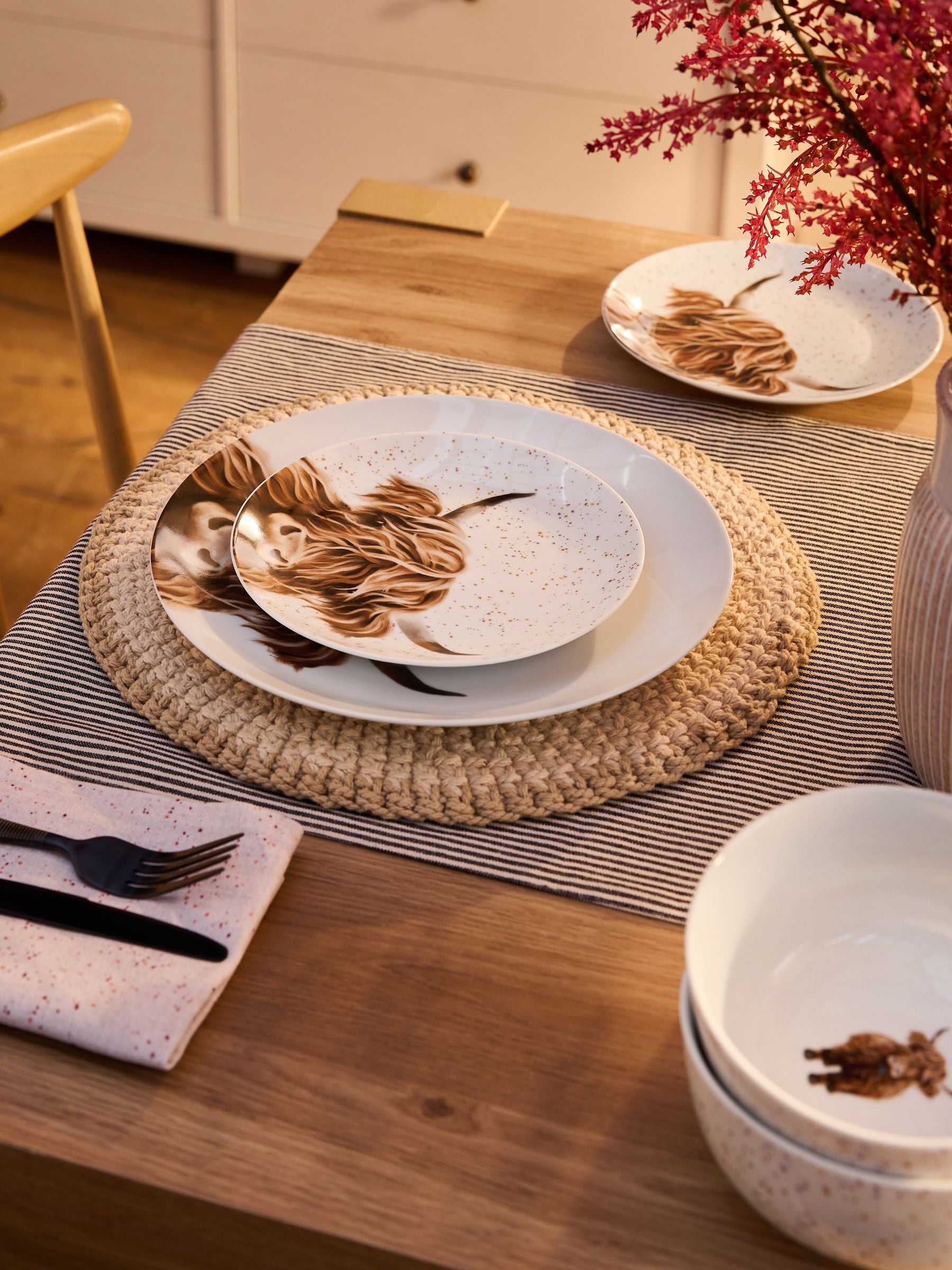 This 12-piece set includes 4 dinner plates, 4 side plates and four bowls, made from clean, crisp porcelain with our favourite highland cow, Hamish in a painted design.