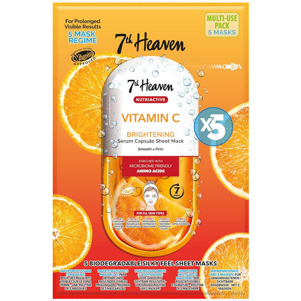 Revitalise tired skin with the 7th Heaven Nutriactives Vitamin C Sheet Mask 5 Pack. This energising treatment helps restore a bright, healthy glow to your complexion. It is formulated to work effectively while being presented in a sustainable multipack format for regular use.