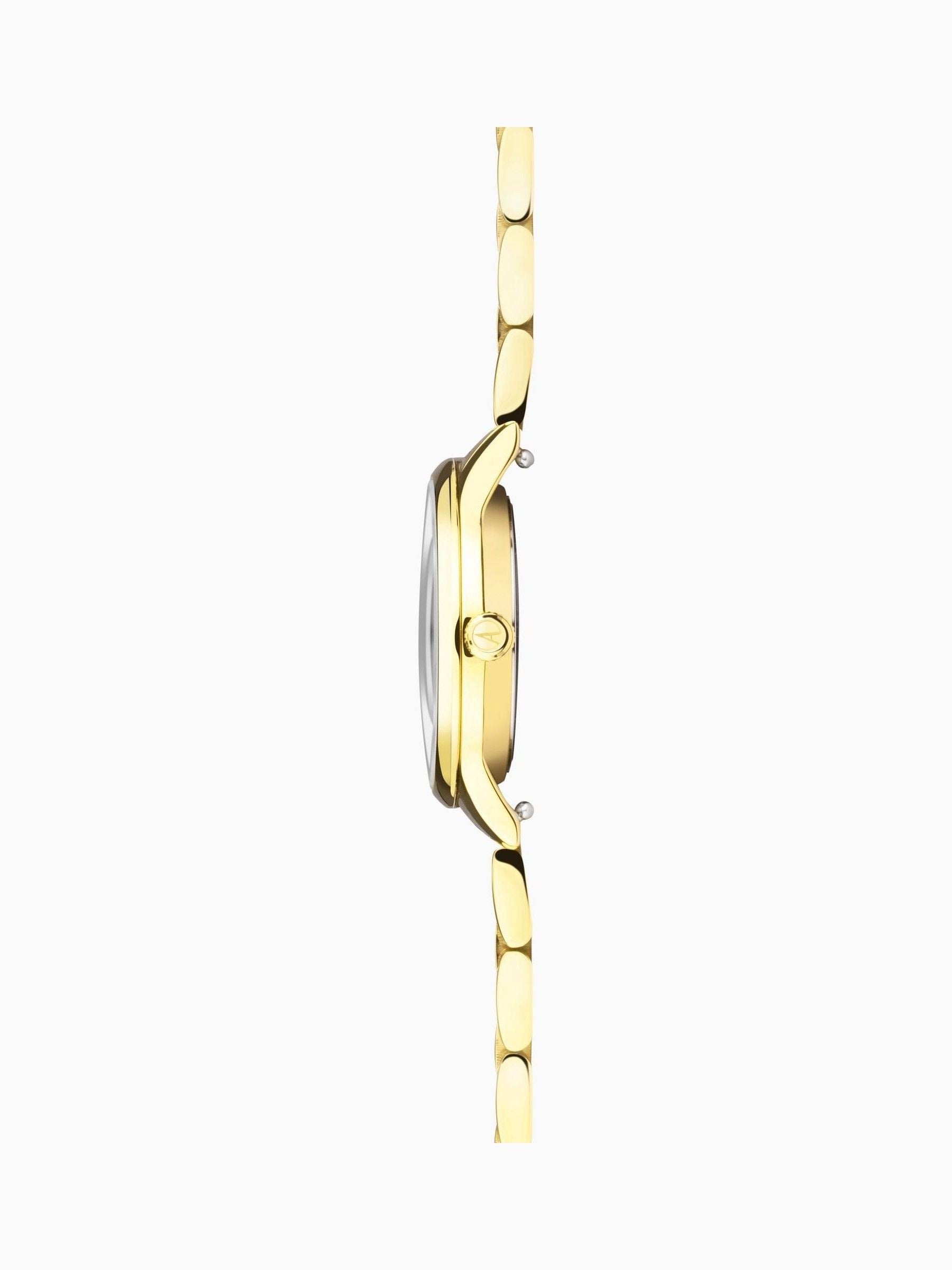 The watch is fastened with an interchangeable gold ion-plated, solid stainless steel bracelet and is water resistant up to 50 metres. Adorn your wrist with a flawless, British designed dress watch.