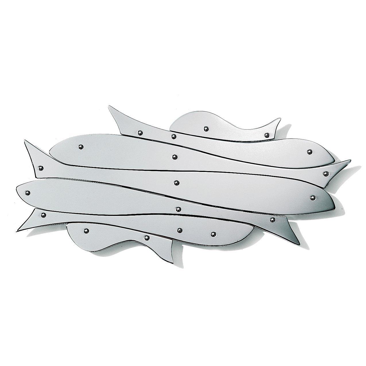 The Alessi Pescher Trivet offers elegant functionality for your kitchen surfaces and belongs in the Cooking & Baking accessory range. This unique item features an decorative trelliswork design, showcasing shining fish details beautifully crafted by the renowned design duo. It is perfectly sized to safely accommodate and protect different pot and dish dimensions securely.