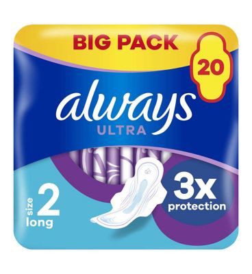 Experience reliable protection with ALWAYS Ultra Long (Size 2) sanitary towels, featuring wings for secure placement. These ultra-thin pads offer three key technological benefits designed to manage your menstrual period confidently.