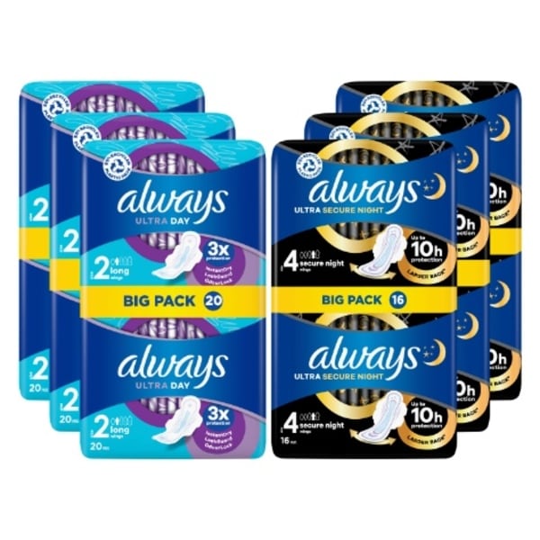 This online-only bundle combines essential protection products for both day and extended night use. You receive three packs of Always Ultra Long Size 2 with wings and three packs of Secure Night Size 4. These pads incorporate advanced technology designed for reliable security throughout your cycle.