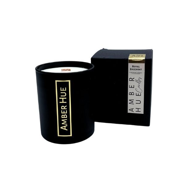 Experience the sophisticated fragrance of the Royal Baccarat Deluxe Candle from Amber Hue. This 200g blend features complex notes of Egyptian saffron, jasmine, and Moroccan almond, blended with amberwood and cedar.