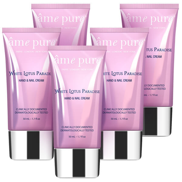 Discover the luxury of âme pure White Lotus Paradise hand cream, supplied in a convenient 5 x 50ml multipack. This lightweight formulation is specifically designed to nourish, protect, and soften hands. It leaves skin feeling velvety smooth and delicately sweet-smelling after every application.