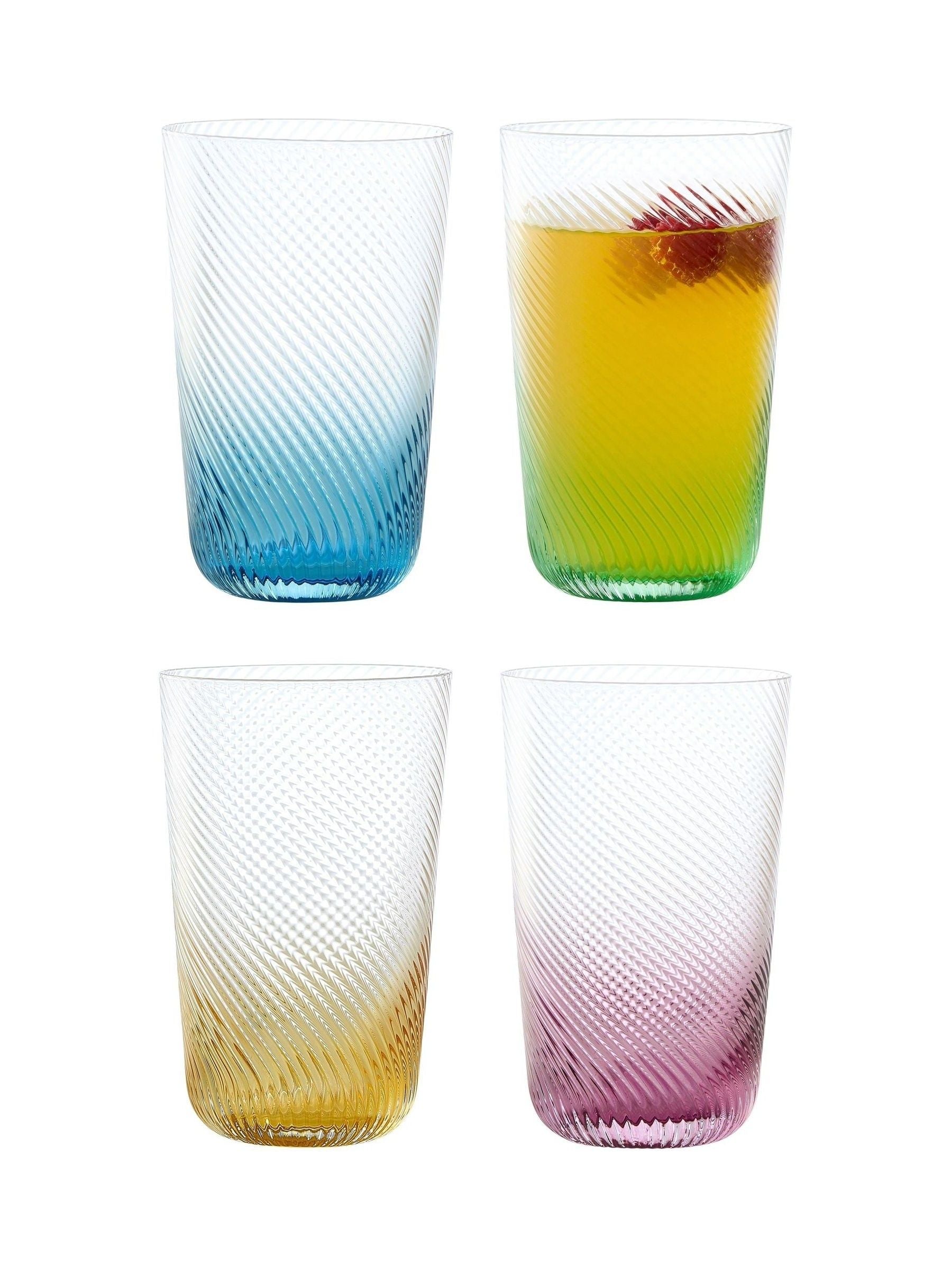 Swirl is a colourful, fun and eye-catching range by Anton Studio Designs. Each glass within this collection has a fresh ombre effect, with the colour fading as it rises up the glass. This look sits brilliantly with the shapely stem, and the mixture of tall, open bowls, all of which are neatly completed with a fine optic which flows around each bowl. Swirl is gift boxed as a harlequin set of four, and is available in four shapes – Flutes, Wines, Gins and Hiball Tumblers. Detailed stem and fine, swirling optic on each glass. The colour fades as it rises up the glass, creating a fantastic ombre effect. Mouth blown and handmade by skilled craftsmen. Hand wash only. Designed in the UK.
