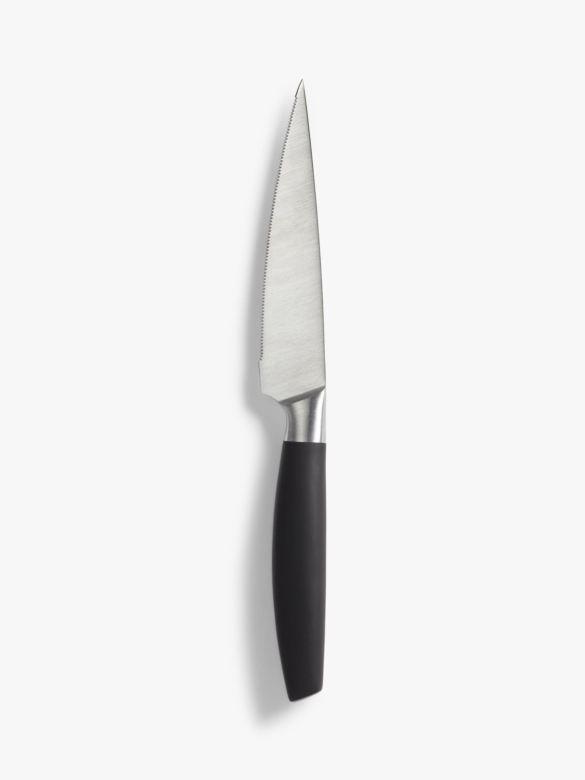 Anyday Soft Grip Stainless Steel Serrated Utility Knife 11.5Cm provides a comfortable, ergonomic cutting experience. This fully forged, full-tang stainless steel tool is extremely durable and versatile for daily kitchen tasks. Slice through tough skins and cured meats effortlessly.