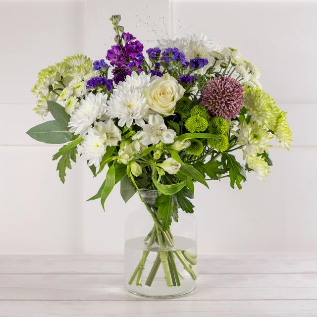 This is a professionally arranged fresh flower vase presentation, combining diverse textures and a harmonious colour palette of whites, purples, and greens. The arrangement features high-quality blooms, including roses and chrysanthemums, designed to enhance any interior setting immediately upon delivery.