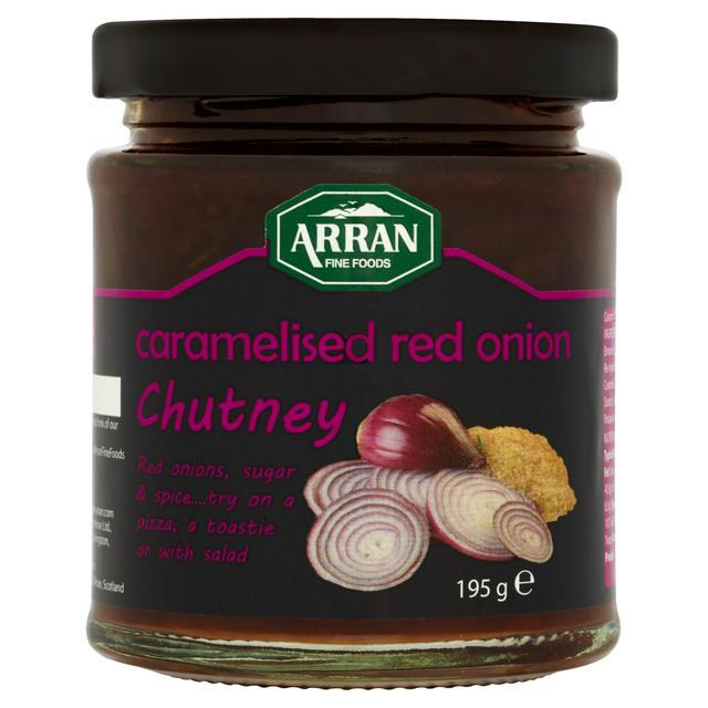 Arran Caramelised Red Onion Chutney offers a rich, sweet and savoury condiment ideal for pairing with cheeses or cold meats. This 195g jar provides convenience and quality flavour for your pantry selection. The recipe combines re-hydrated red onions with brown sugar and red grape vinegar for a balanced taste profile.