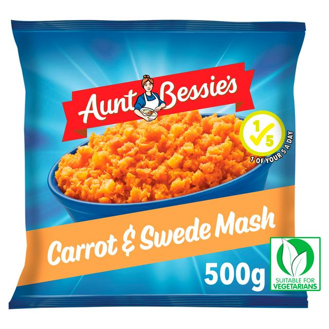 Aunt Bessie's Carrot Swede Mash combines juicy carrots and crunchy swedes with butter and seasoning for a wholesome side dish. This vegetarian-friendly mash is ready to serve in just three minutes, offering convenience for family meals. It provides one of your five daily portions of fruit and vegetables.