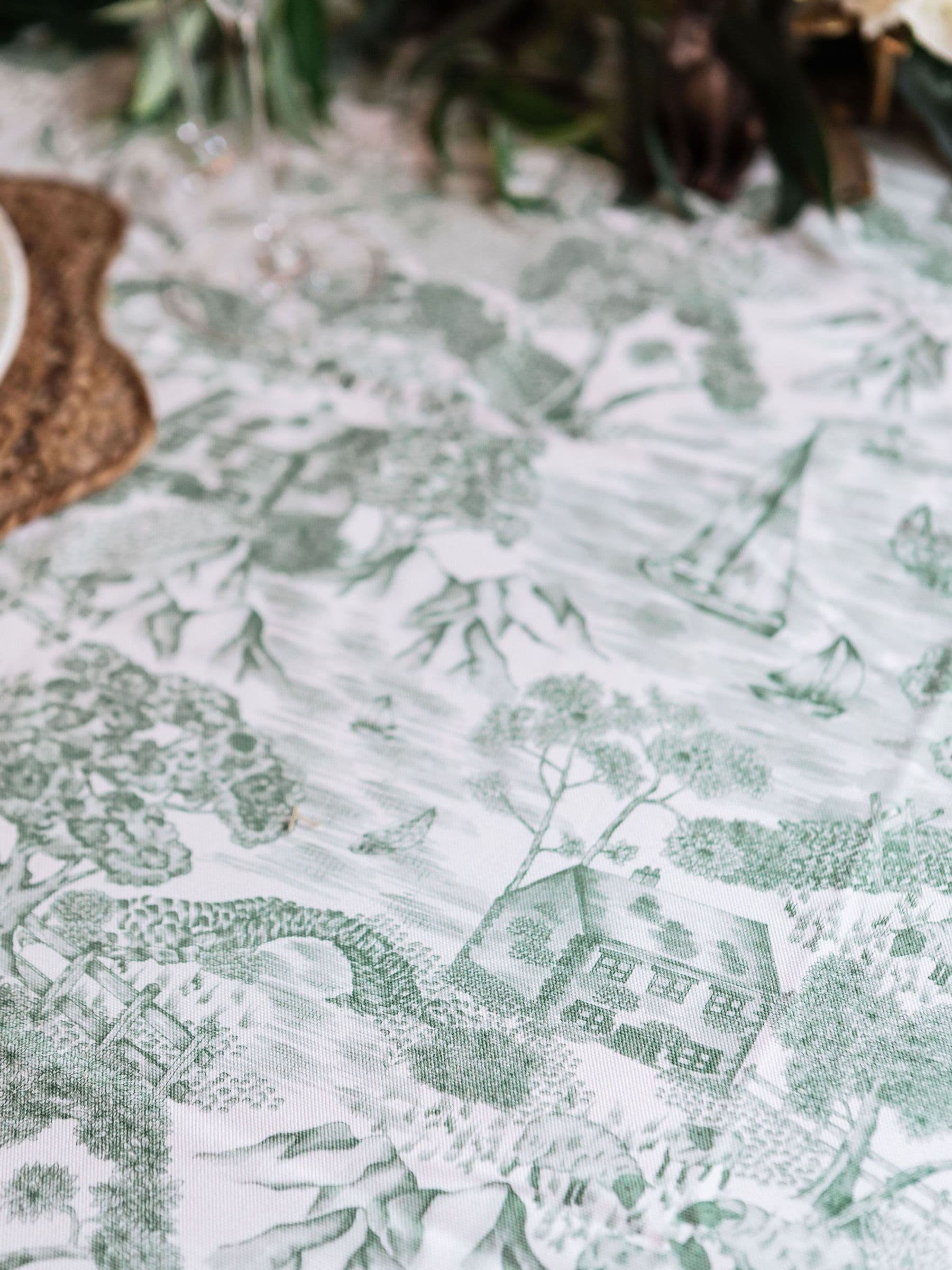 Our exclusive new Lake District Toile captures the spirit of slow living in one of Britain’s most beloved landscapes — where dry-stone walls and drifting sheep meet sailing boats and borrowed cottages. Printed in a soft green on a warm cream ground, this detailed countryside scene takes cues from traditional French toile de Jouy but swaps Versailles for valleys, mountains, and misty lakes. Made in the UK from 100% cotton, it brings a poetic touch to the table — ideal for Sunday roasts, christening lunches, or a quiet breakfast with the paper (and a pot of proper tea). Available as: tablecloths, napkins, runners, tea towels, and oven gloves. Machine washable. Best styled with buttered crumpets, ironed linen, and someone who knows how to reverse a trailer.