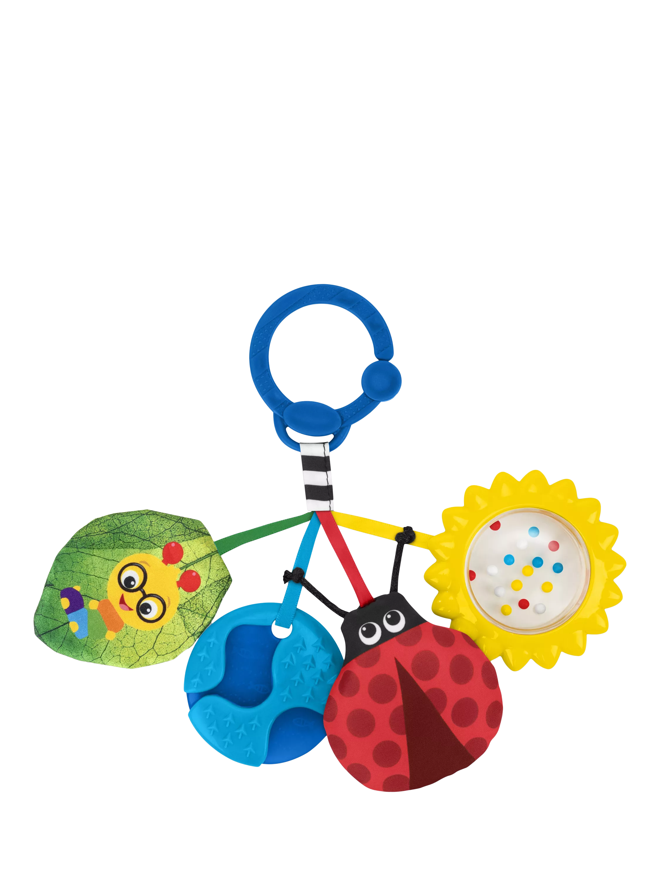 Easily connect to a diaper bag to take on the go or attach to a carrier for mobile play. Includes 4 nature-themed, sensory toys: ladybug squeaker, sun with rattle beads, textured earth toy, and crinkle leaf featuring Cal the Caterpillar.