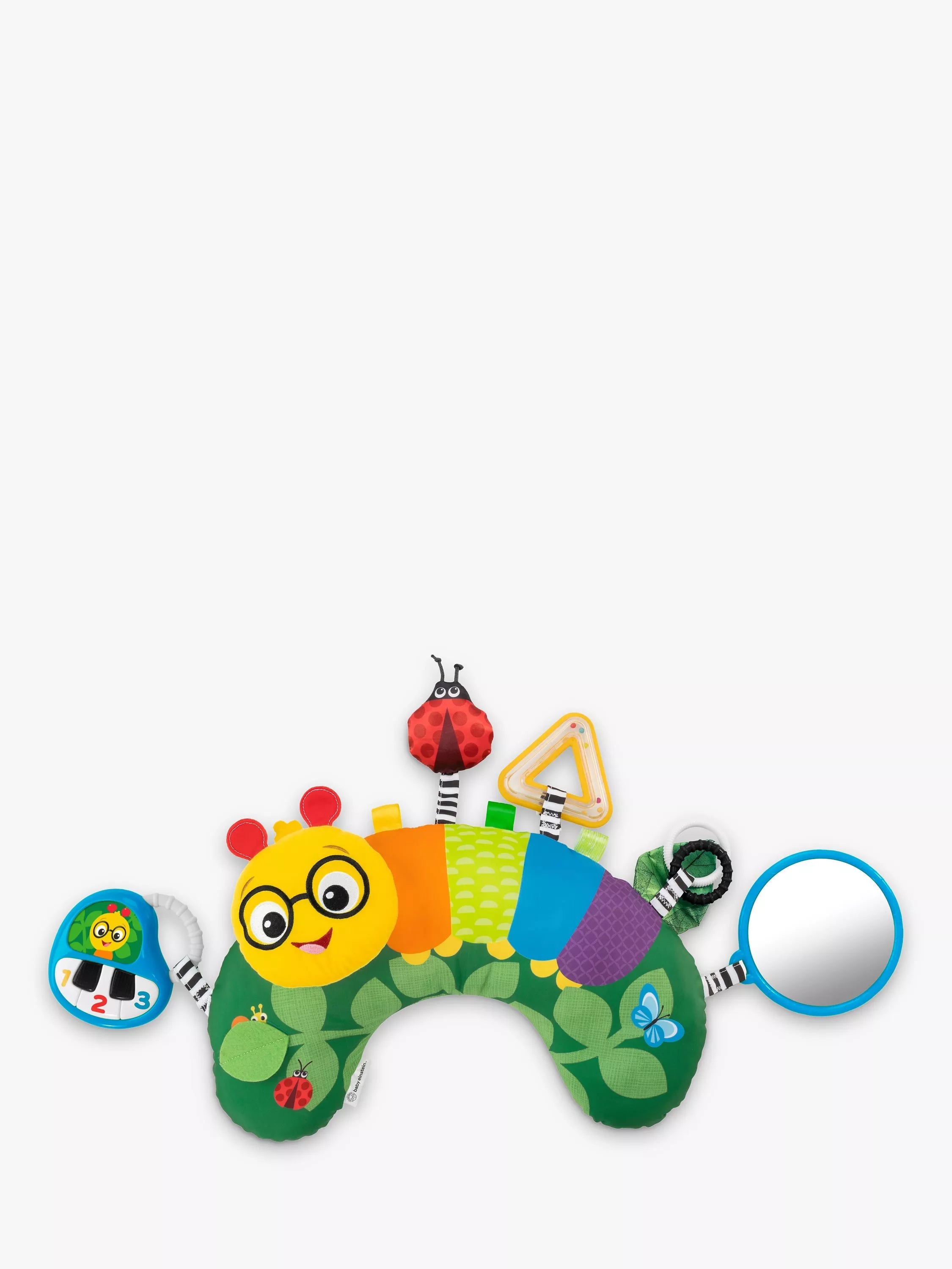 Featuring Cal the Caterpillar, this soft, supportive pillow features 9 multisensory elements to engage baby, promote sensory learning, and encourage extended tummy time sessions. Baby will love to shake the triangle toy to create rattle sounds, or delight in squeezing the ladybug to make her squeak! A lift of the felt flap reveals a friendly snail, and the included mini piano entertains baby with soft, glowing lights and 20+ songs, sounds, and phrases. A baby-safe mirror encourages self-discovery, and the pillow’s crinkle leaf, 2 clacker beads, and colourful, rainbow tags promote fine motor skill development.