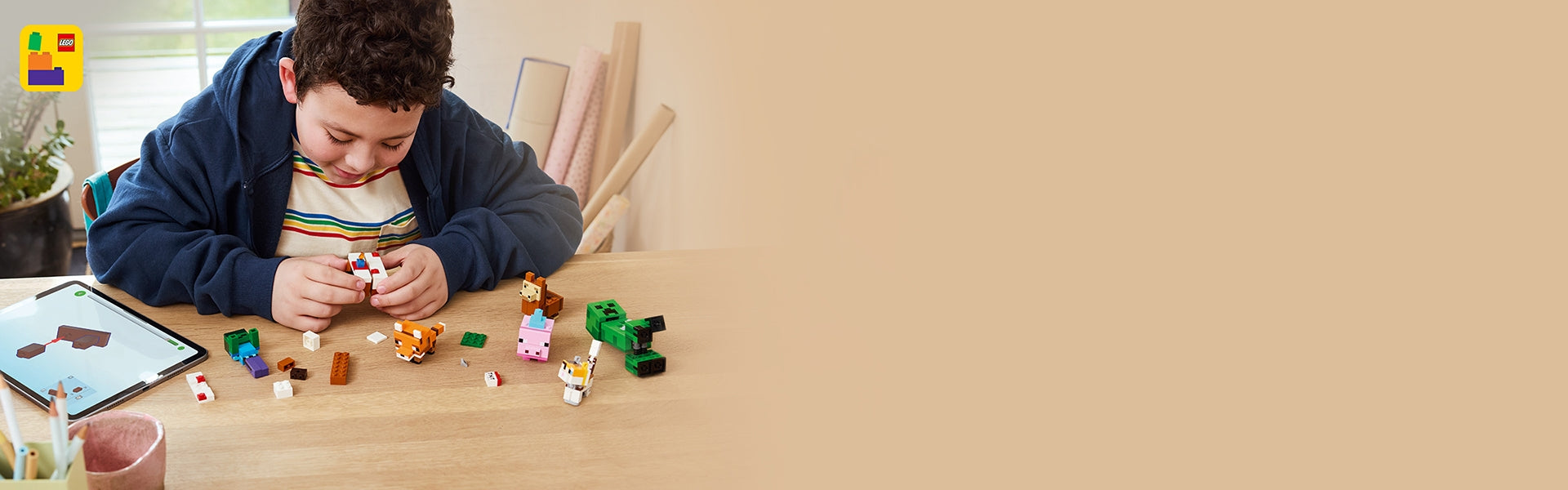 This party-themed gift is filled with LEGO Minecraft models and character mobs. There’s a Creeper™ figure with movable legs and head and an opening compartment on the top of its head where gunpowder can be found (in the form of a small, gray element); a baby zombie with movable head, arms and legs; a baby fox with movable head, legs and tail; a baby cat with movable head, legs and tail; a baby llama with movable legs; a baby pig with movable head; and a cake that can be separated into 3 pieces. For extra creative fun, the LEGO Builder app lets kids zoom in and rotate models in 3D using their digital device.