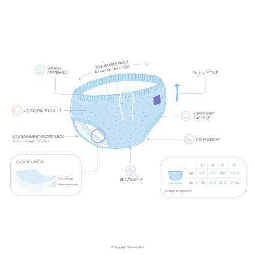 Read MoreKeep your baby trendy while they tread the water with Bambino Mio's award-winning reusable swim nappies. Perfect for use in the pool and on holiday too! This swim nappy is easy to use as no additional nappy needs to be worn with this product. The drawstring waistband means it's easy to put on and is comfortable and secure. It has a concealed water resistant layer and leak-proof legs which offer containment while in the water.* Made from a lightweight super soft fabric which is beautifully soft against skin and does not weigh your baby down in the water.