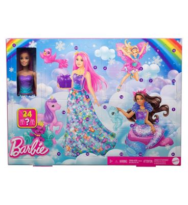 Add fantasy to the holidays with the Barbie Advent Calendar featuring fantasy-themed surprise gifts! Open one surprise a day for 24 days (or sometimes all at once!) for a super-fun unboxing experience. Kids will discover a pink-haired Barbie doll on the first day, and then fashion and storytelling accessories to transform her into a mermaid, a royal or a fairy as more are revealed! The daily gifts include a mermaid tail, fairy wings, baby unicorn and other magical pet friends, fantasy headbands and other fun items. With so many surprises, the Barbie Advent Calendar set makes a fantastical gift for kids ages 3 years old and up. Doll cannot stand alone. colourss and decorations may vary.