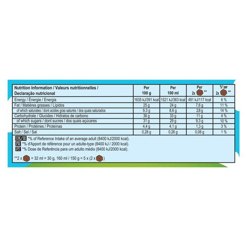 Sugar, reconstituted skimmed MILK, vegetable oils (sunflower, rapeseed), cream (MILK) (10%), coconut fat, glucose syrup, skimmed MILK powder, fat reduced cocoa powder (2.5%), cocoa powder (2%), EGG yolk, whole MILK powder, WHEAT flour, emulsifier (lecithins), salt, stabilizers (guar gum, locust bean gum), natural flavourings. May contain rye, barley, oat, soy, peanut, almond, hazelnut, walnut, cashew, pecan nut, brazil nut, pistachio, macadamia nut. > Fairtrade cocoa, sugar. Sugar with mass balance. Total 29%F. Δ cocoa sourced via Open Chain total: 72% FVisit info.fairtrade.net/sourcing