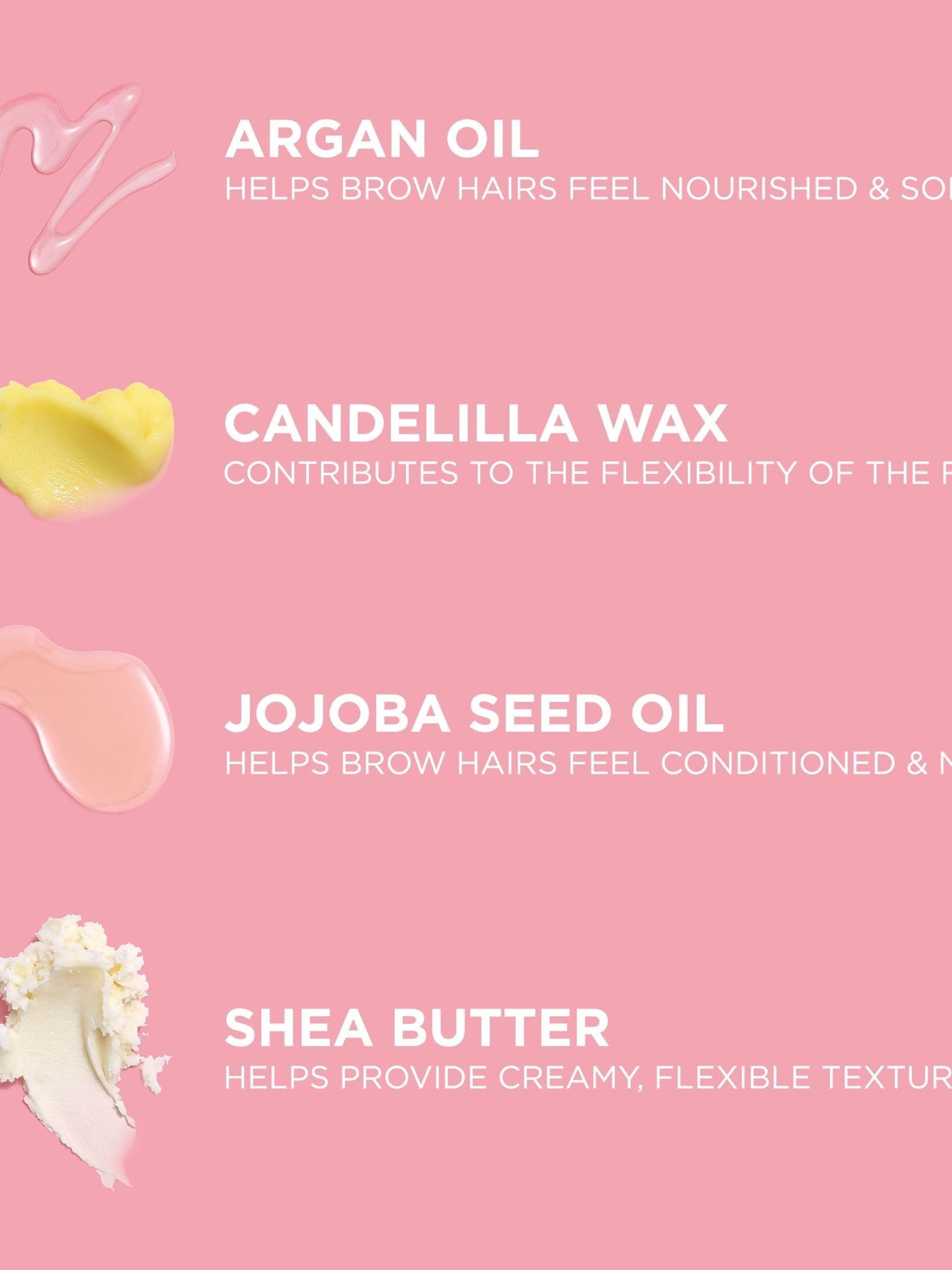Fluff Up Brow Wax Fluff Up Texturizing & Flexible Eyebrow Wax• Fluffs, feathers and texturizes brows• Flexible, reworkable hold• Flake-free and dries clearWHY WE LOVE ITThe Good FluffFluff Up Brow Wax is a clear, crunch-free and creamy flex-wax that creates fluffy, full and natural-looking brows. How the fluff does it work? The specially developed bristle brush evenly deposits a thin layer of lightweight wax throughout brows. The formula is buildable with reworkable hold for versatile shaping before drying down clear with a natural-matte finish. The end look: fluffy, feathered and texturized brows that last 12 hours. Flake-free and crunch-free. 12-hour* longwear. Waterproof, sweatproof and humidity-proof. 93% said it easily feathers brows. 97% said it has reworkable hold. 96% said brows look fuller. Good ingredients? Fluff yeah! Jojoba Seed Oil helps brow hairs feel conditioned and nourished, Shea Butter helps provide creamy, flexible texture AND helps brow hairs feel conditioned andnourished. Argan Oil helps brow hairs feel nourished and soft instrumental test on 30 participants self-evaluation by 115 participants after 1 week