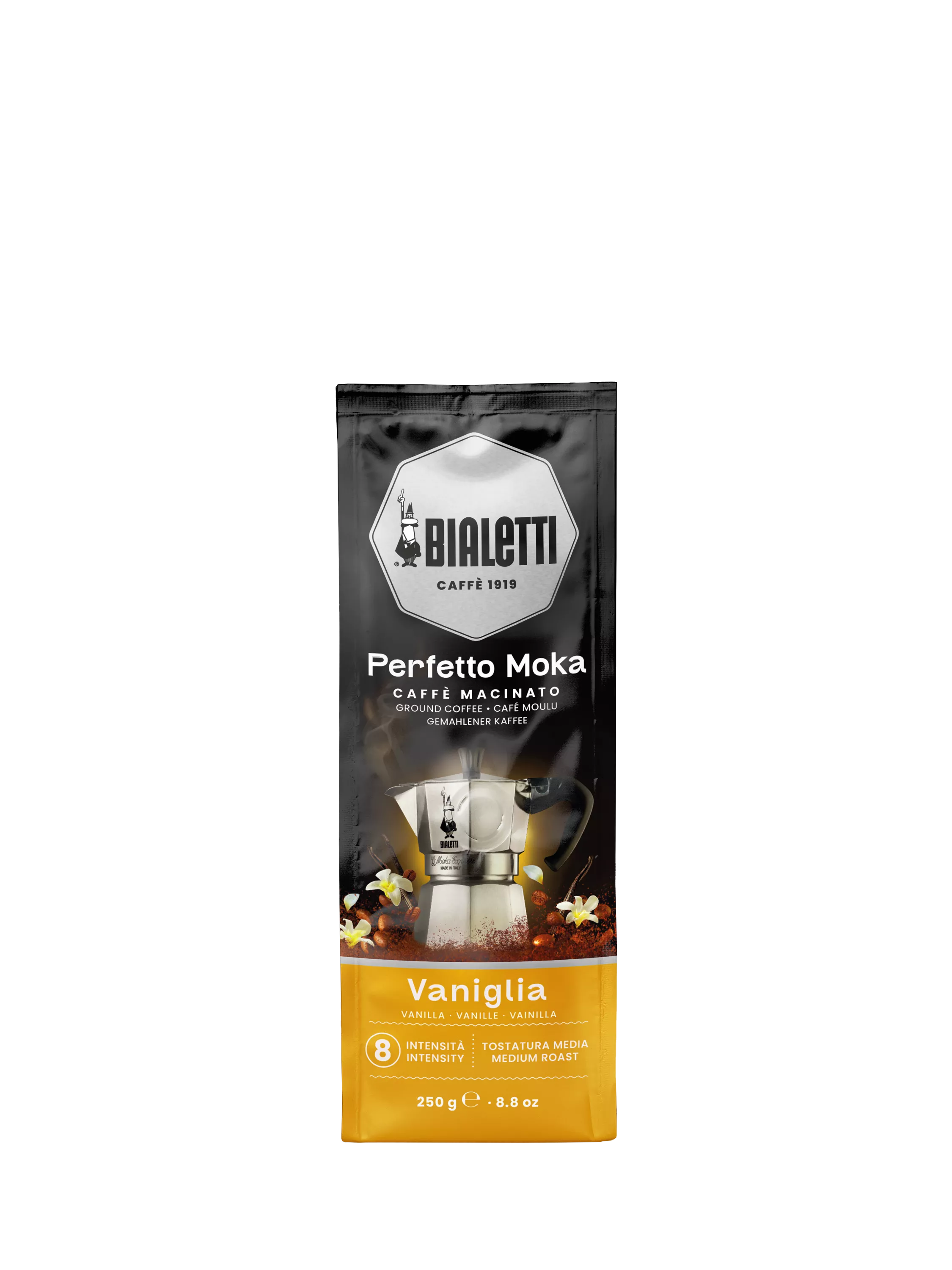 Bialetti's Moka Perfetto Vaniglia ground coffee is an aromatic blend from arabica coffee beans, perfectly suited to Bialetti's Moka coffee maker. Its delicate structure is enhanced by a vanilla-flavoured, sweet, delicate taste. Perfetto Moka Vaniglia adds the best vanilla beans to a long, structured Italian roast for a fragrant coffee, just slightly different to your usual.