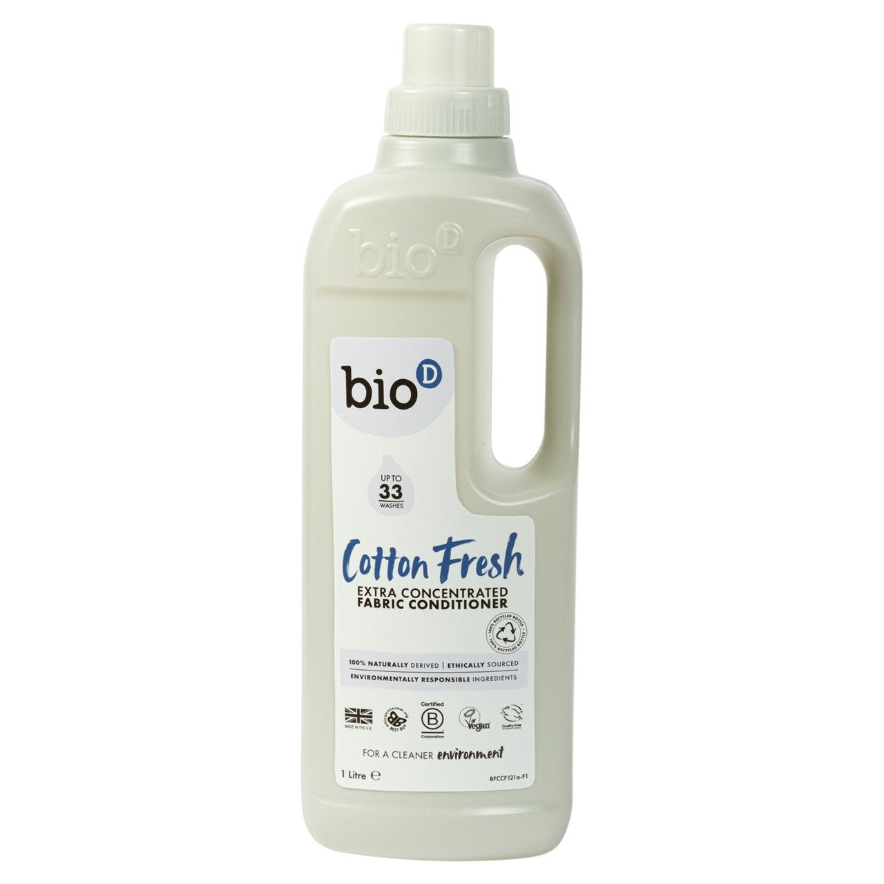 Bio-D Cotton Fresh is an extra concentrated fabric conditioner that leaves your laundry exceptionally soft and free from static cling. It is delicately fragranced using natural essential oils for a fresh laundry scent. This powerful formula offers great efficiency, delivering up to 33 washes from the 1-litre bottle.