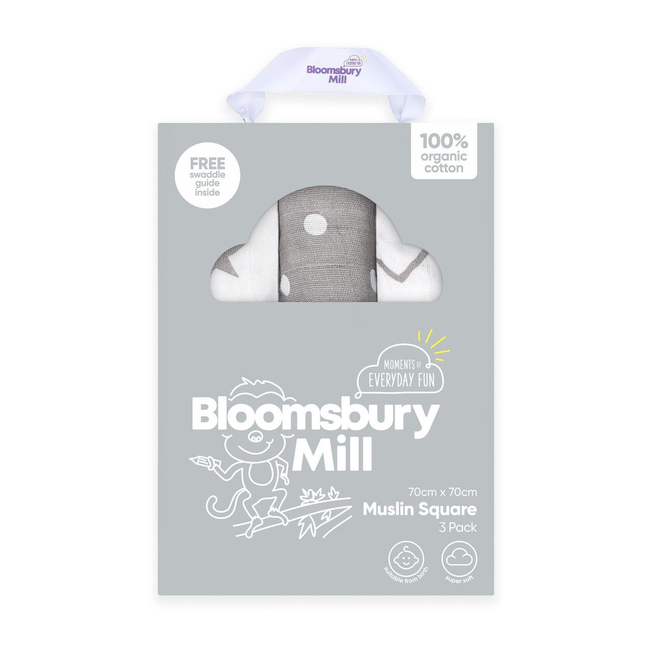 Bloomsbury Mill offers generously sized organic cotton muslin squares suitable for numerous daily baby tasks. These cloths are made from 100% GOTS-certified organic cotton, ensuring they are exceptionally soft and breathable for delicate skin. This set includes three grey cloths featuring classic star, polka dot, and chevron prints.