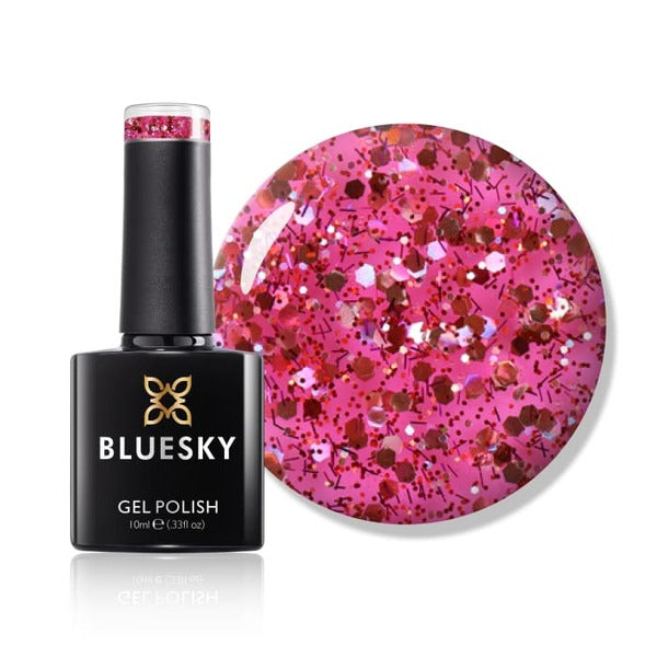 This Bluesky gel polish in the 'Cuba' shade delivers a vibrant pink glitter finish suitable for any occasion, ensuring a standout look. It sets quickly, providing a durable high-gloss appearance designed for extended wear without chipping or dulling. For best performance, always apply with a corresponding gel base and top coat.