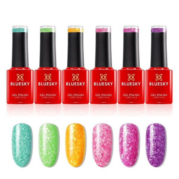 This Bluesky mini collection allows you to sample six distinct glitter neon shades without committing to full sizes. This professional gel nail polish system delivers a high-gloss finish that resists chipping for several weeks. For optimal results, ensure you use this product with the necessary gel base and top coats.