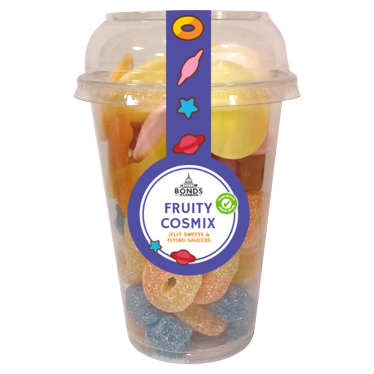 This Bonds of London Fruity Cosmix Candy Cup offers a delightful assortment of confectionery presented in a convenient, clear container. It combines chewy jelly sweets with classic flying saucers, providing varied texture in every handful. This specific confectionery blend is notably formulated using a vegan recipe.