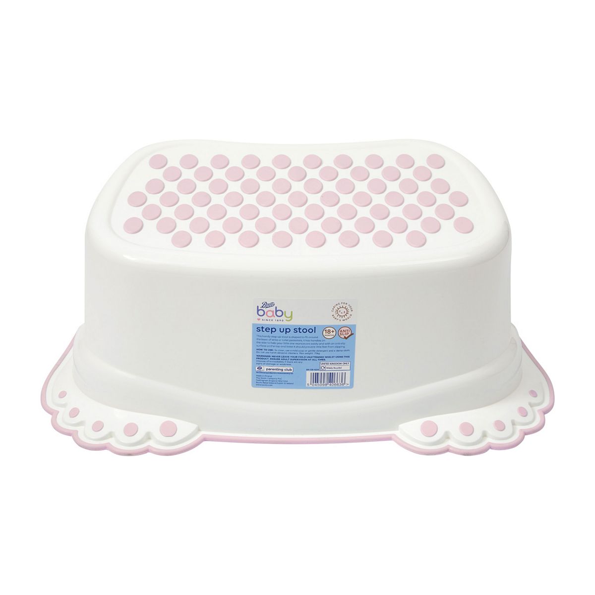 This handy step-up stool is shaped to fit around the base of sinks or toilet pedestals and has handles on the side to help your little one move it easily. Our stool also has an anti-slip surface on the top and base which should prevent little feet from slipping.
