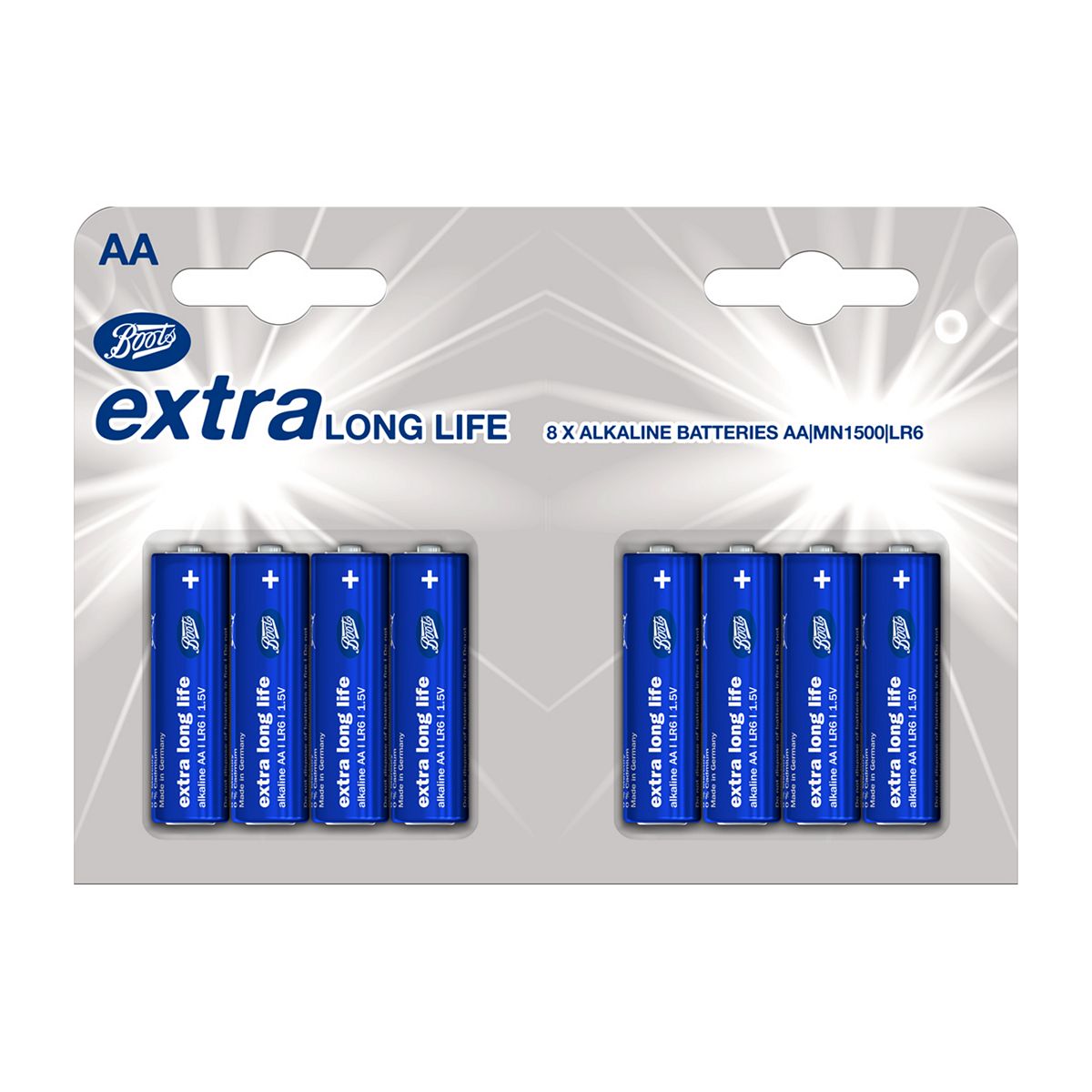 Boots XLL batteries AA 8s Boots AA Extra Long Life Alkaline Batteries. Boots AA Extra Long Life Alkaline Batteries are specifically designed give superior performance over zinc chloride batteries.