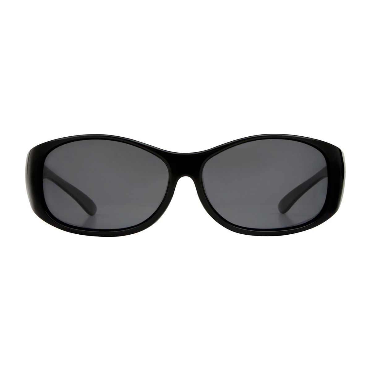 Boots Optical Cover Sunglasses - Shiny Black FrameBoots Optical Covers Collection small sunglasses in shiny black with solid smoke polarised lenses. Designed to fit over prescription glasses.