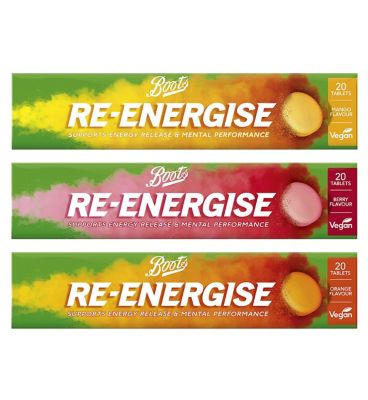 Boots Re-Energise Orange 20 Effervescent TabletsB Vitamins, Vitamin C and Minerals Orange Flavoured Food Supplement with Sweeteners, 20 TabletsWhat does it do?