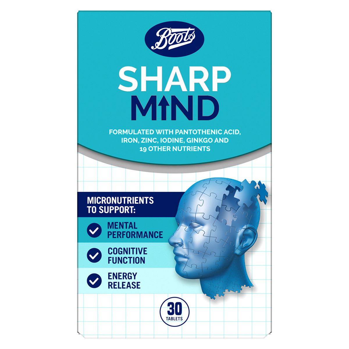 Multivitamin & Mineral Food Supplement with Ginkgo Biloba, 30 tablets What does it do? At Boots we understand how important a focussed mind and overall mental vitality is for you to be at your best. Sharp Mind is expertly formulated for your hectic lifestyle and to give you that little extra support day to day. This formula contains optimal levels of Pantothenic Acid (B5) to support mental performance and concentration, Zinc and Iodine to maintain cognitive function, and Vitamins B6 and B12 to release energy and reduce tiredness and fatigue. We added Ginkgo extract as a natural ingredient dating back over 270 million years and traditionally used in eastern medicine. Free from Artificial Colours, Flavours and Preservatives. Lactose Free. Suitable for Vegetarians.