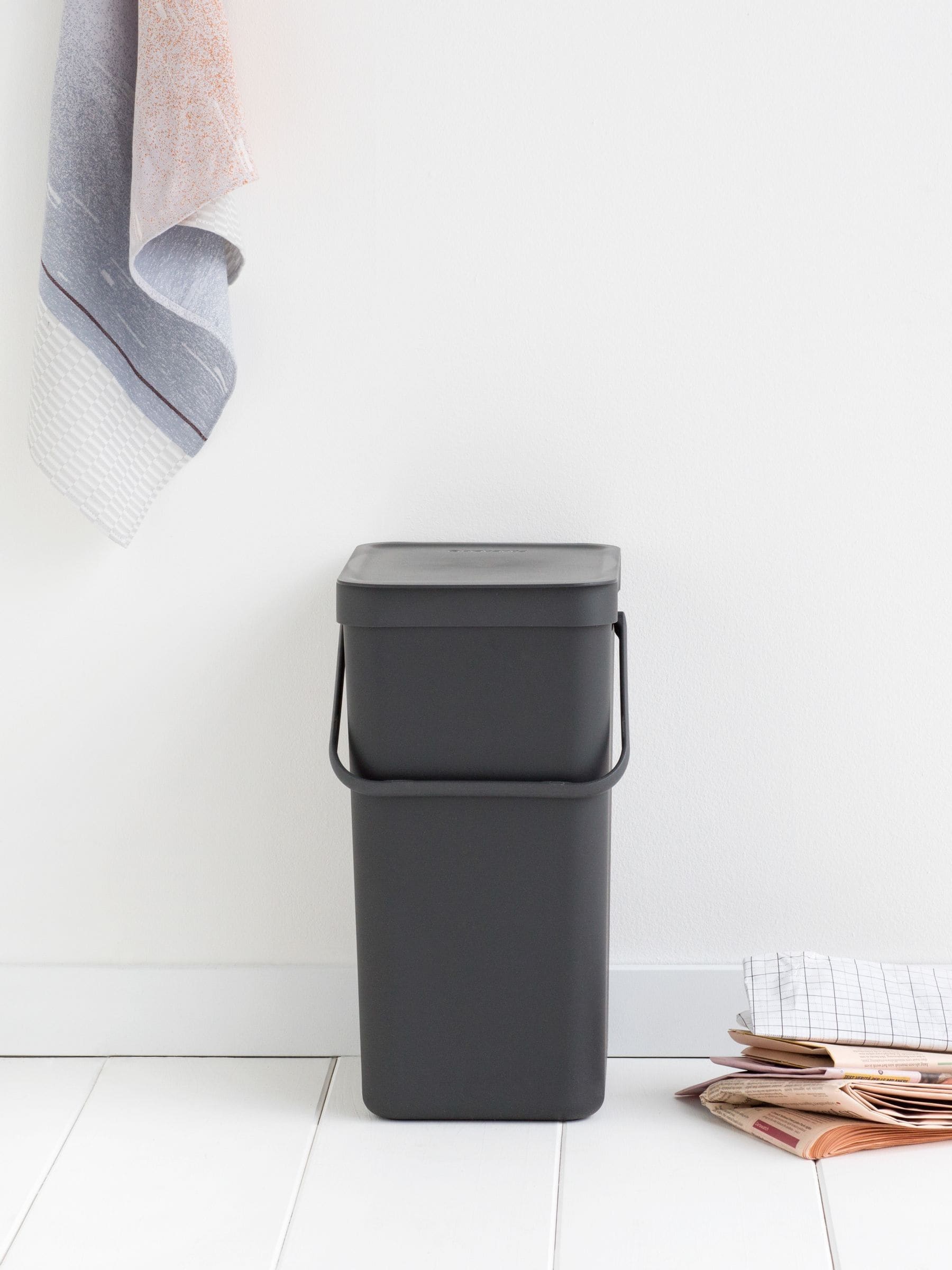 Collecting empty packaging, bottles, or cans? Make it easy with this 16 litre Brabantia Sort & Go Recycle Bin. Put it in any corner, flat against the wall, or save even more floor space and hang it from its wall bracket. Time to empty it? Piece of cake, because of the large handle and bottom grip for easy carrying and emptying. Sort & go!