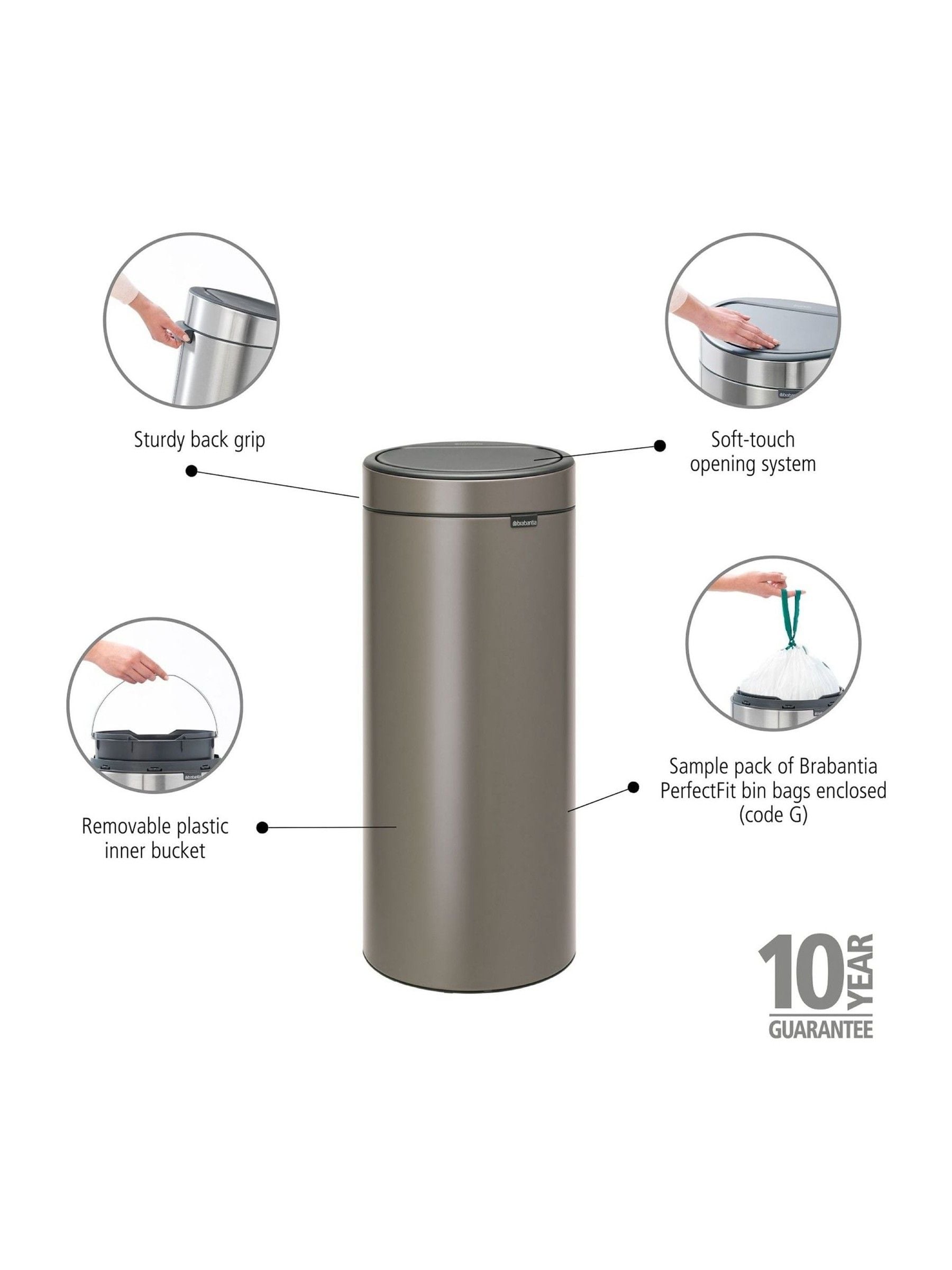 Ready for the next step in organising your home? Get your hands on the Brabantia Touch Bin 30 litre. This sturdy bin is easy to clean, protects the floor from scratches, and opens smoothly, thanks to the soft-touch opening system. It really is easy! Roomy - L volume (30L). Opens at the lightest touch - soft-touch opening system. Easy to clean - removable plastic inner bucket with ventilation holes. Easy to move, even when full - sturdy back grip. Perfect match - sample pack of Brabantia PerfectFit bin bags enclosed (code G). Problem-free use - 10-year guarantee and service.