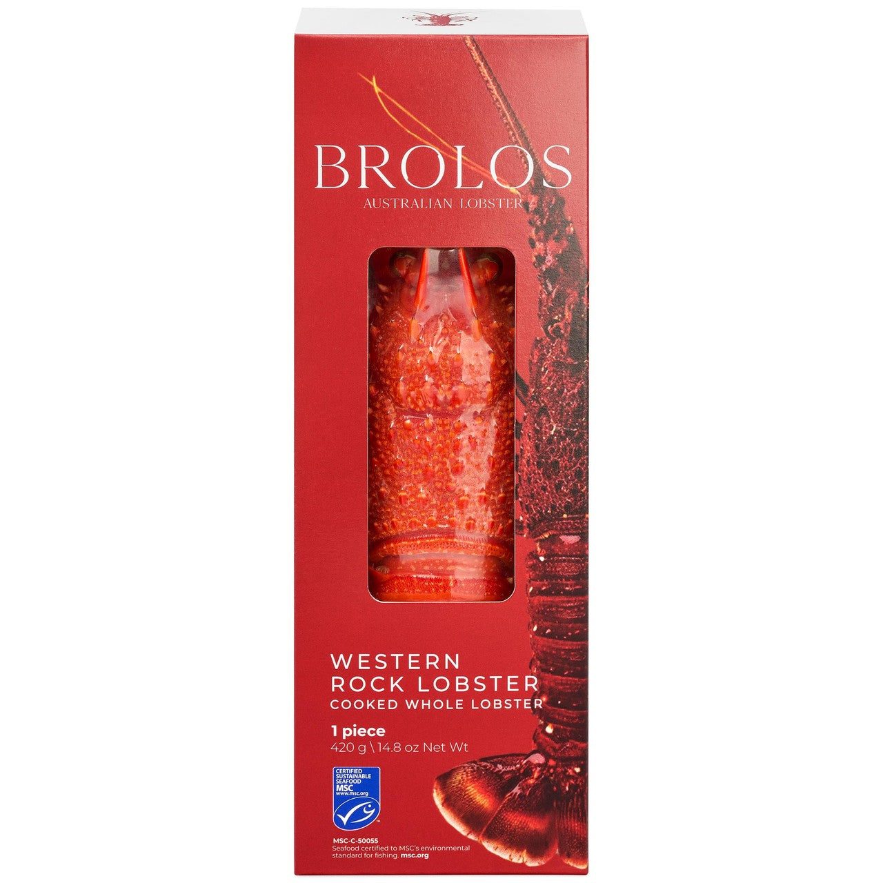 This Brolos product presents a cooked whole Western Rock Lobster, offering a premium and satisfying seafood centrepiece for your table. Sourced specifically from Australian waters, this 420g whole lobster provides both excellent quality and serving convenience. Consumers can trust the purchase due to the clear MSC certification visible on the packaging.