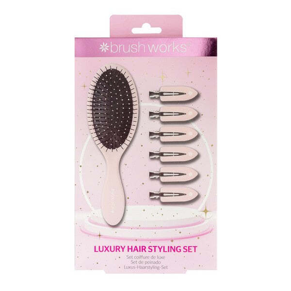 This Brushworks Luxury Hair Styling Set in a gorgeous pink tone provides essential tools for effortless hair management. It combines a gentle detangling brush with practical clips for various beauty routines. This lightweight collection offers functional essentials for your daily hair care needs.