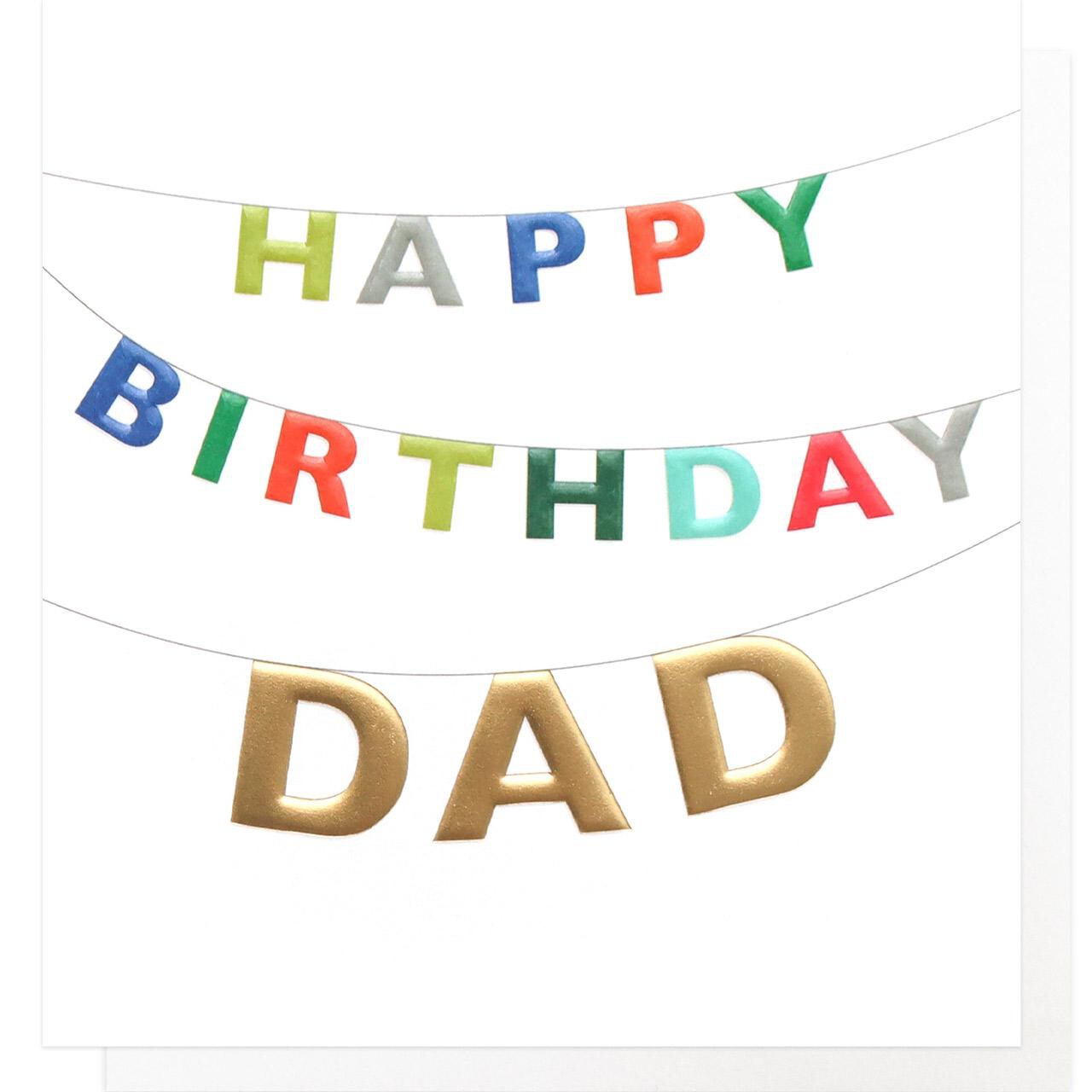 This Bunting Dad Birthday Card showcases loving messages displayed as colourful bunting across the front design. The card uses bright, bold lettering to create a cheerful aesthetic intended to bring happiness. It is designed specifically as a contemporary greeting for a father's special day.