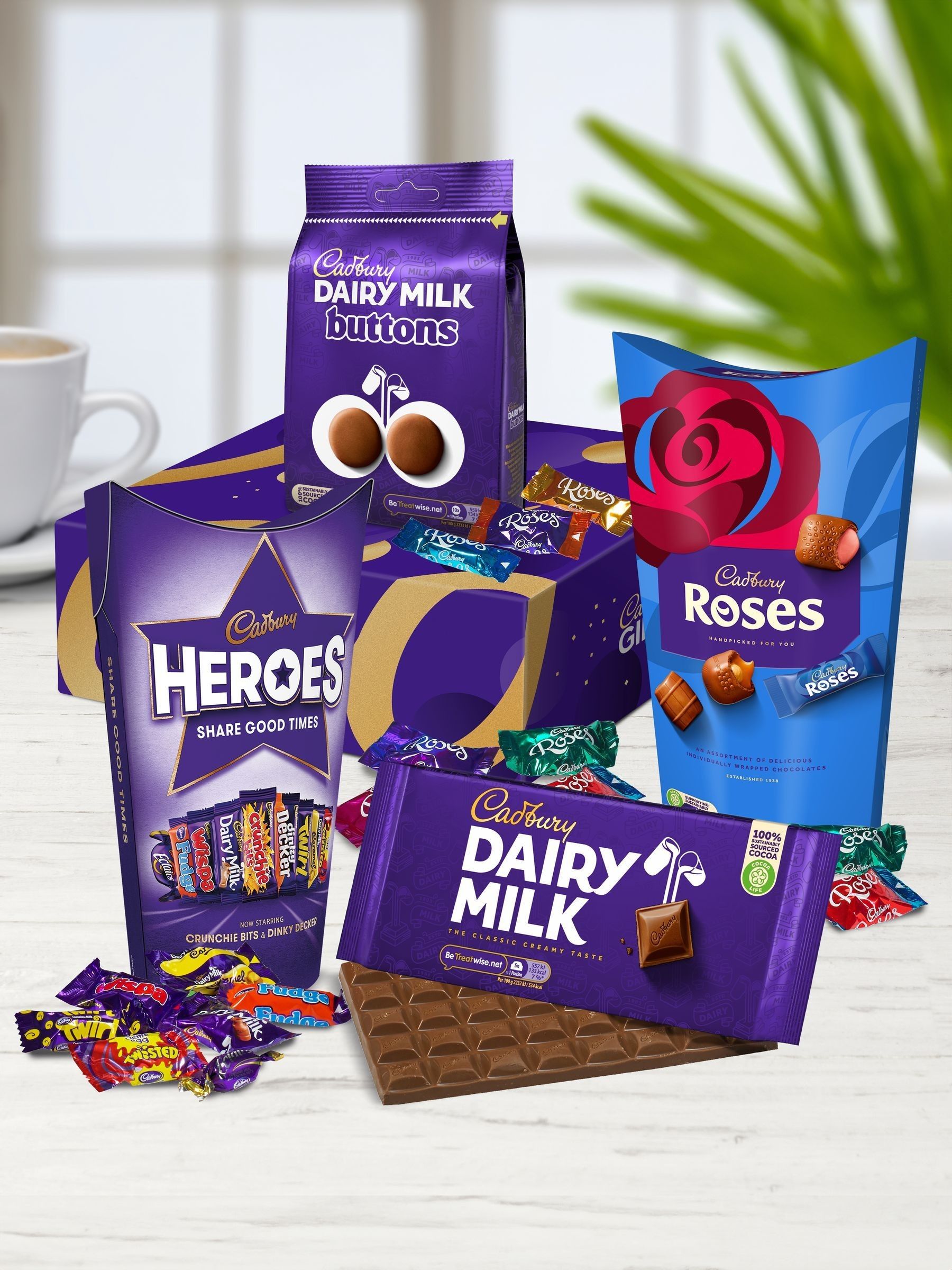 Contains; 1 x Cadbury Dairy Milk Chocolate Bar 110g, 1 x Cadbury Roses Chocolate Carton 290g, 1 x Cadbury Heroes Chocolate Carton 290g, 1 x Cadbury Dairy Milk Chocolate Buttons Bag 100g.