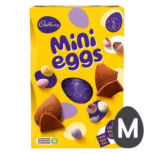 A deliciously thick Easter egg, made from classic, creamy Cadbury Dairy Milk chocolate, with a double helping of our Cadbury Mini Egg bags on the side. The perfect Easter gift for any Cadbury Mini Egg fan. Made with sustainably sourced cocoa. Vegetarian friendly.Package Type