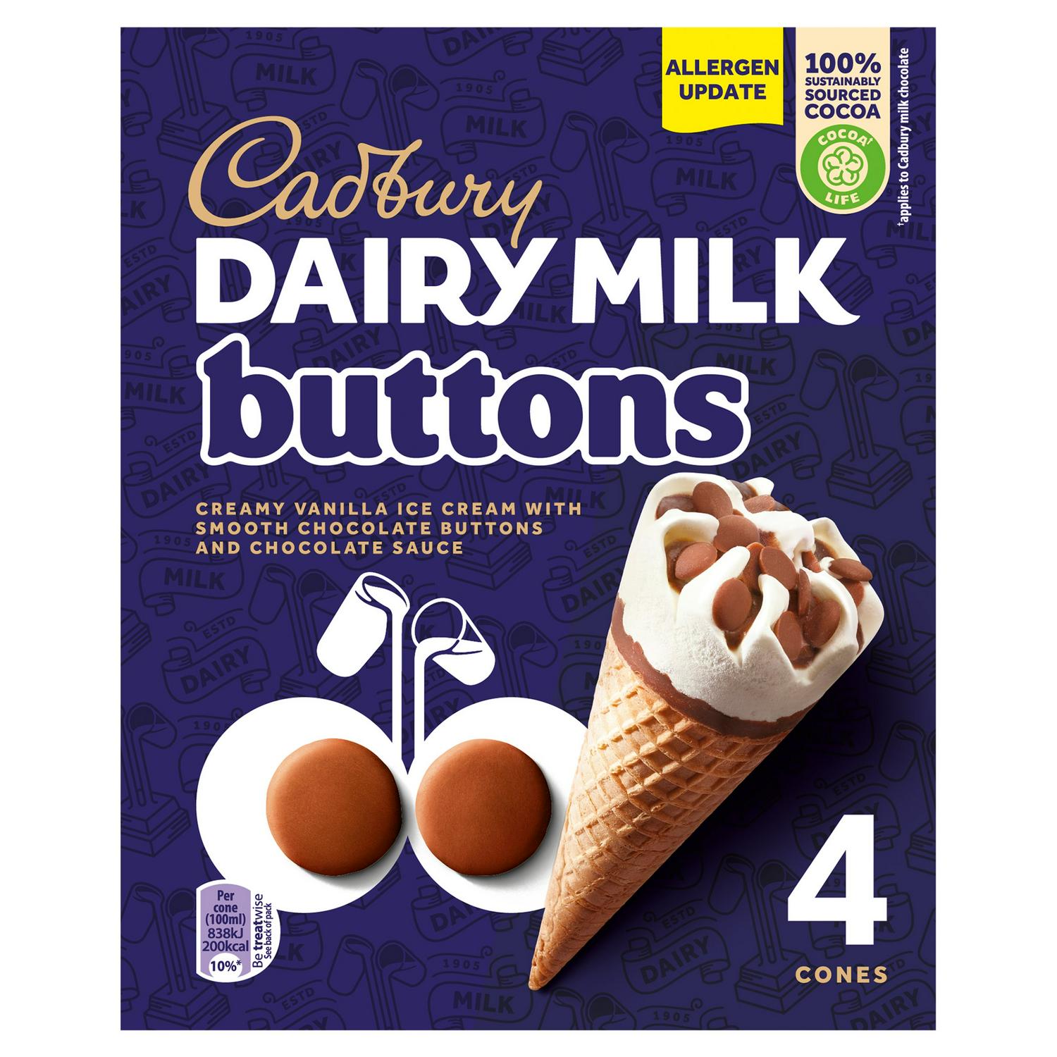 This dessert combines a crunchy biscuit cone filled with creamy vanilla flavour ice cream for a satisfying texture. It is layered throughout with smooth milk chocolate sauce and finished with an abundance of mini Cadbury Milk Chocolate Buttons. This indulgent treat is specifically made suitable for vegetarians to enjoy. Furthermore, the Cadbury milk chocolate components feature 100% sustainably sourced cocoa via the Cocoa Life programme.