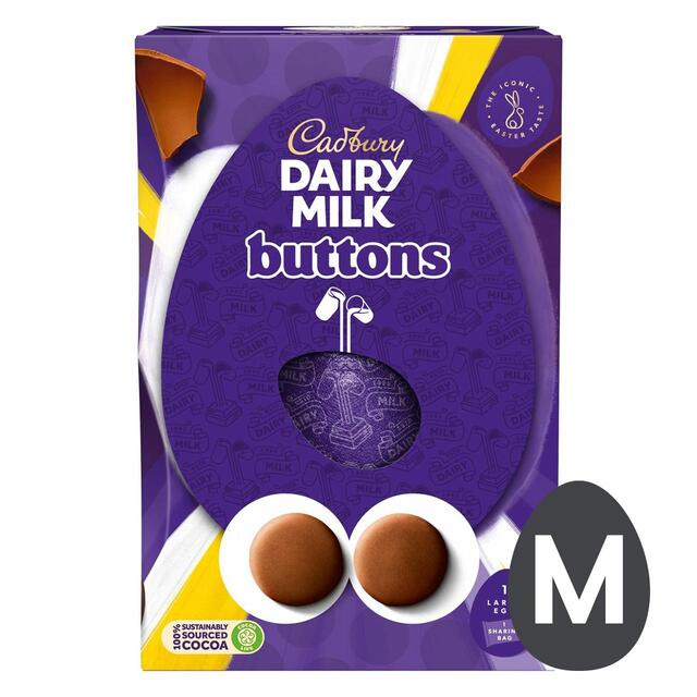 Limited Time Offer 2 for £5. Offer ends on the 13th March 2024.A delicious Easter egg made from classic, creamy Cadbury Dairy Milk chocolate filled with our famous Giant Chocolate Buttons. Now thatâs a gift that will make their Easter morning extra special. Expect giant hugs in return. Made with sustainably sourced cocoa. Vegetarian friendly.