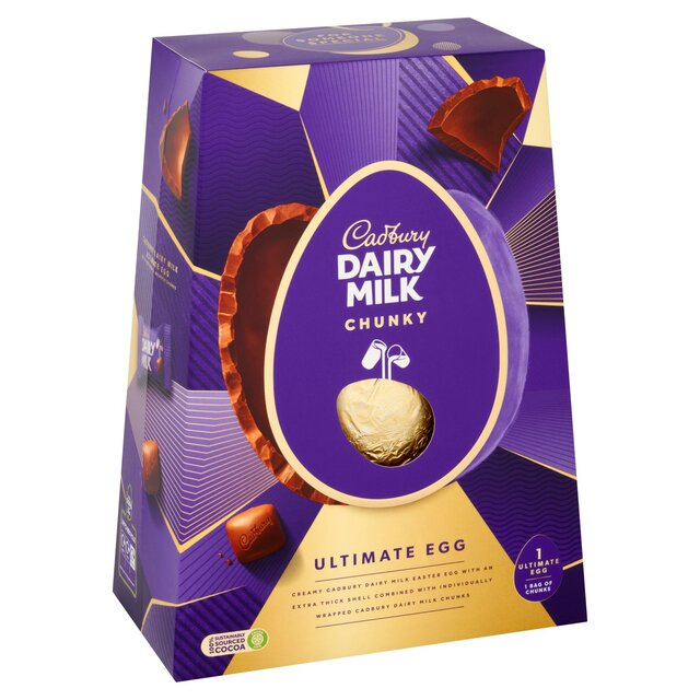Creamy Cadbury dairy milk Easter Egg with an extra thick shell combined with individually wrapped Cadbury dairy milk chunksYour Easter Egg has been made with Cadbury dairy milk