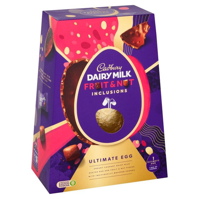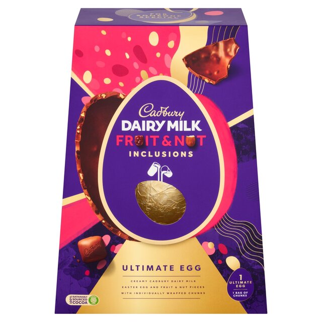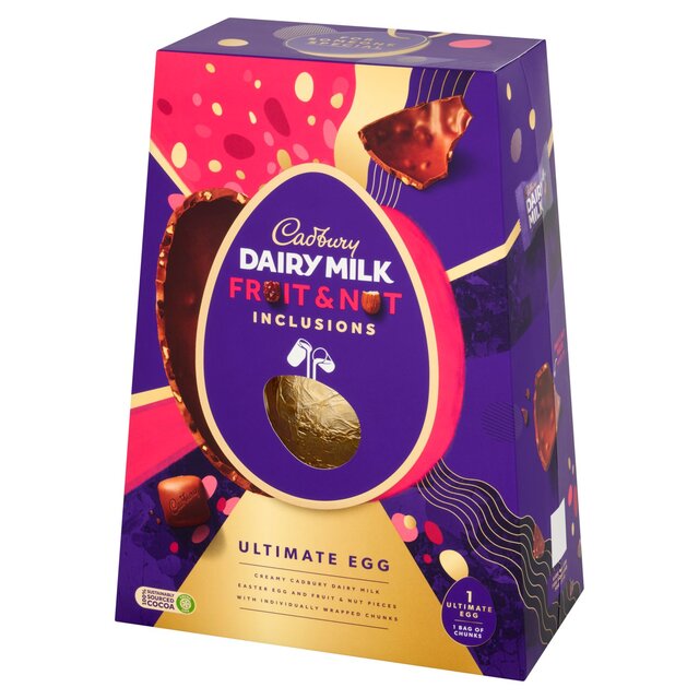 Creamy Cadbury dairy milk Easter egg and fruit & nut pieces with individually wrapped chunksYour Easter egg has been made with Cadbury dairy milk