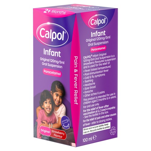 CALPOL Infant Original 120mg/5ml Oral Suspension 100ml is a strawberry flavoured syrup that provides soothing relief from fever (raised temperature), post-immunisation fever, cold and flu symptoms, teething, headache, sore throat, earache, and other aches and pains.