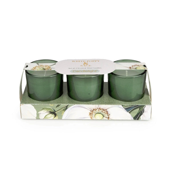 scent white poppy sageset of 3 votive candleseach candle burn time approx 8 hourstinted glass jareach candle measures h6cm x w5cm each votive crafted in stunning coloured tinted glass offers a warm and inviting glow perfect for enhancing the ambience of any room in your home infused with uplifting floral scents this set promises to uplift your spirits and infuse your home with a lasting enchanting fragrance ideal for both everyday use and special occasions these votives serve as a stylish complement to any dcor while filling the air with a refreshing floralcitrus perfume perfectly housed in an elegantly designed box this set makes an ideal gift or a splendid addition to your own decor