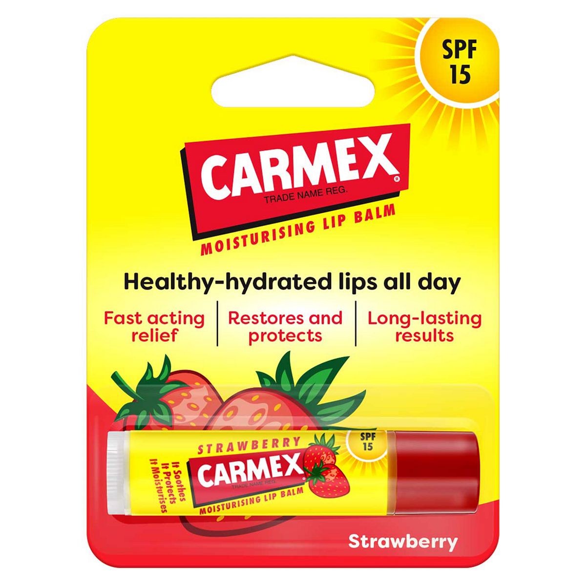 Carmex Strawberry's super moisturising formula provides superior, enhanced hydration and makes even the driest lips soft and supple again. It soothes. It Moisturises. It Protects.