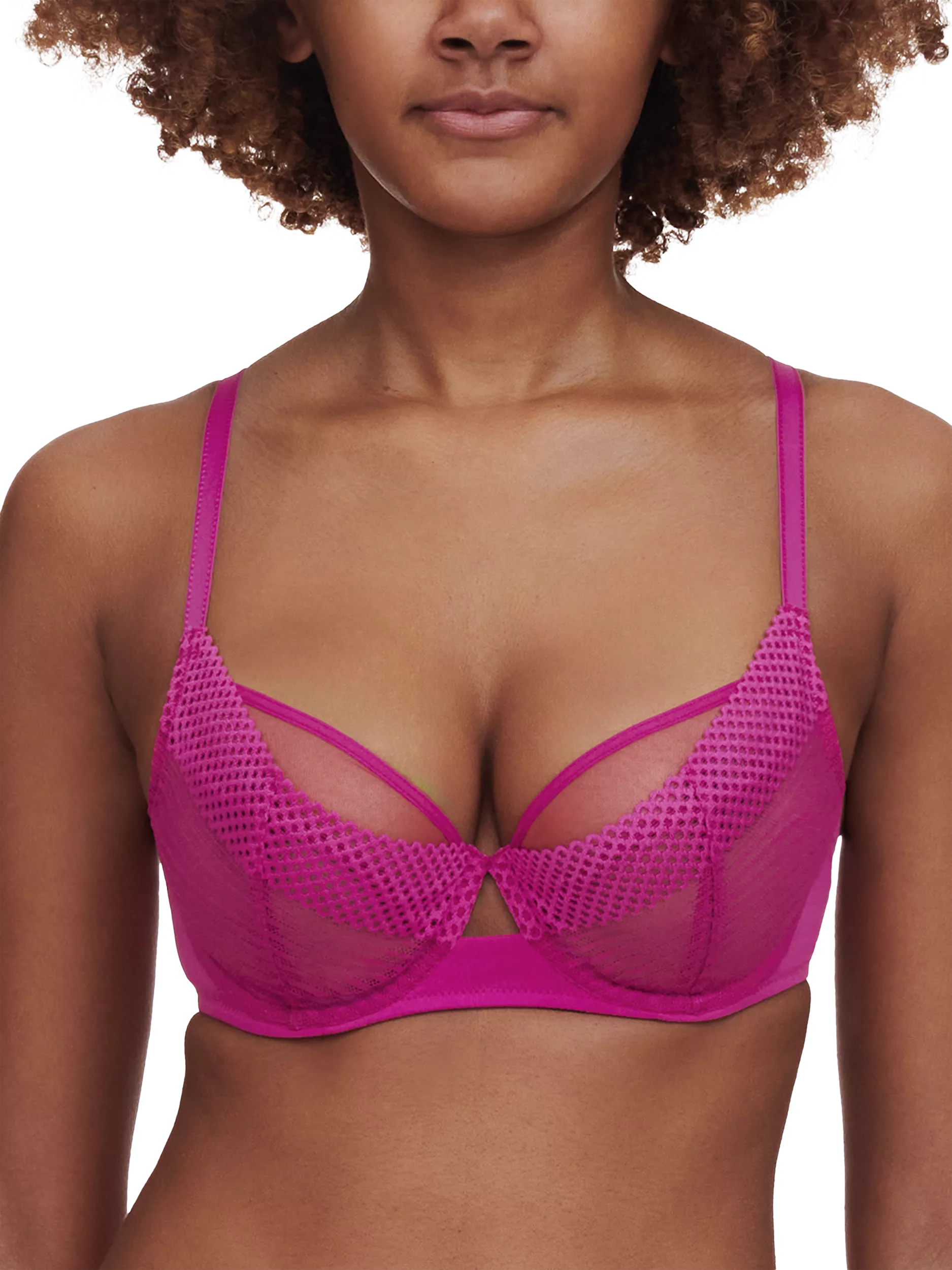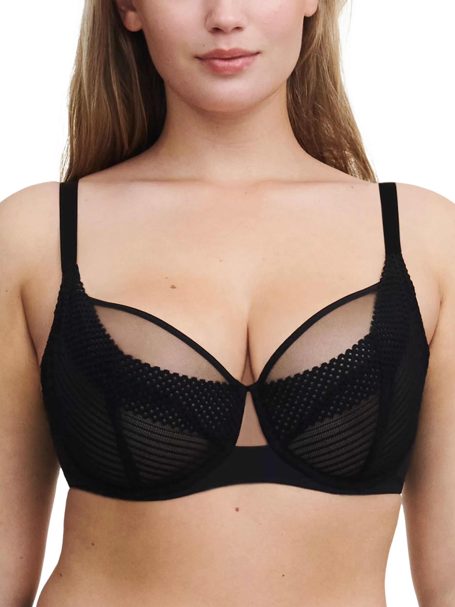 A new full-bust underwired bra shape from Chantelle Pulp. Designed with a 3-part tulle construction on the cups that provides a centred, rounded and lifted bust shape from C-G cups. The lace over the cups reinforces the centring effect and support. The thin and flat elastic finish on the neckline provides easy fit benefits and adaptability in all sizes.