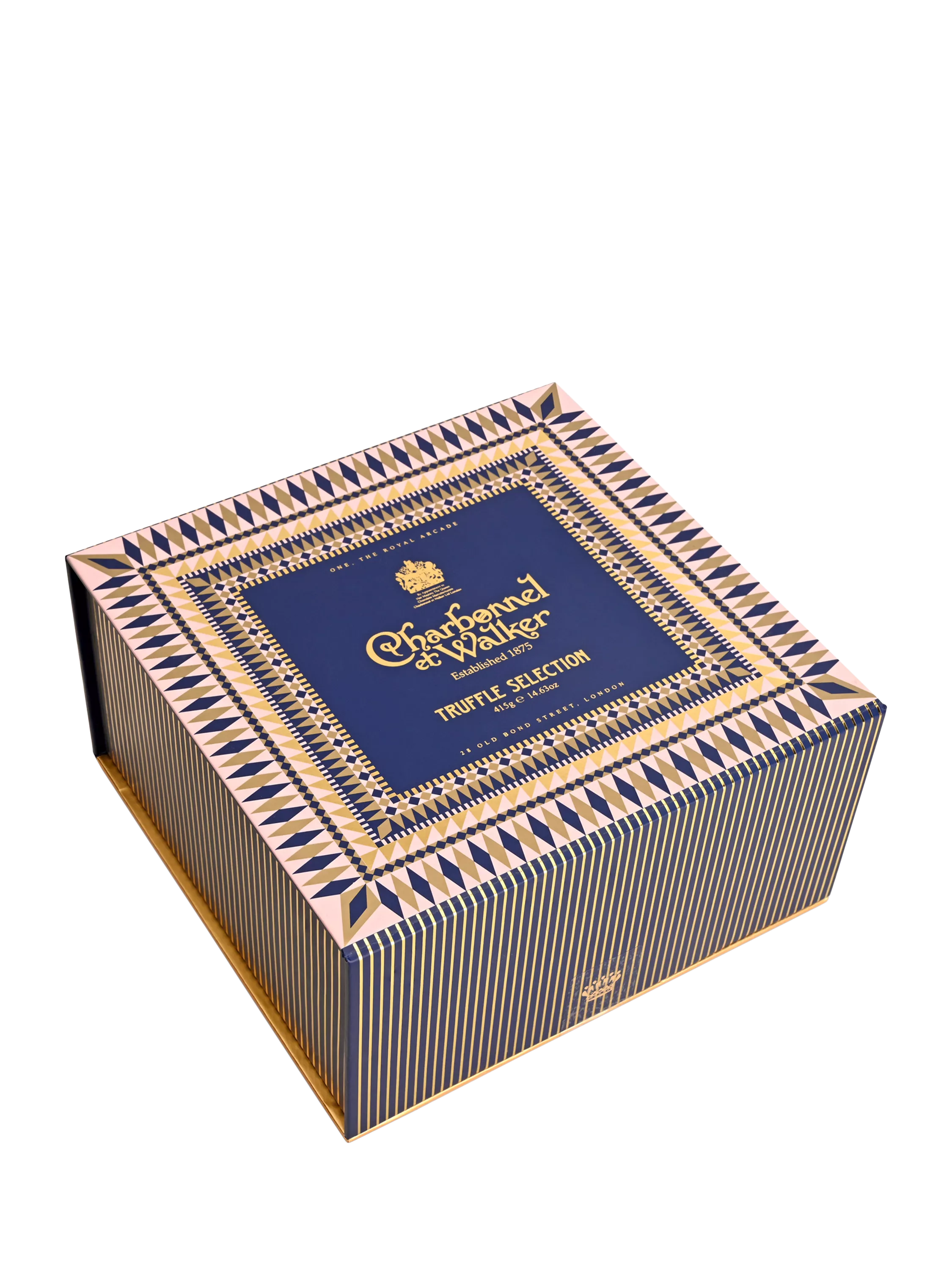 A startlingly beautiful gift box for very special celebrations indeed. Decorated in a geometric Victorian design in navy, pink and gold, this elevated gift box holds a surprise. Open the lid to discover a delicious layer of decadent chocolates and truffles.