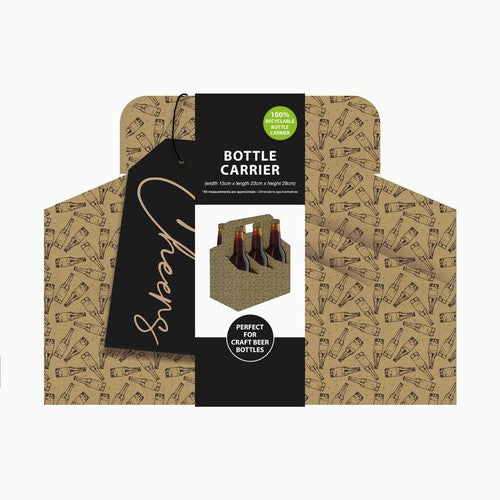 This Cheers cardboard carrier provides a convenient method for presenting bottle-shaped items as gifts. It is constructed to securely hold up to six standard large bottles. The carrier features an engaging all-over print depicting bottles, complementing its purpose as a simple yet attractive packaging solution.
