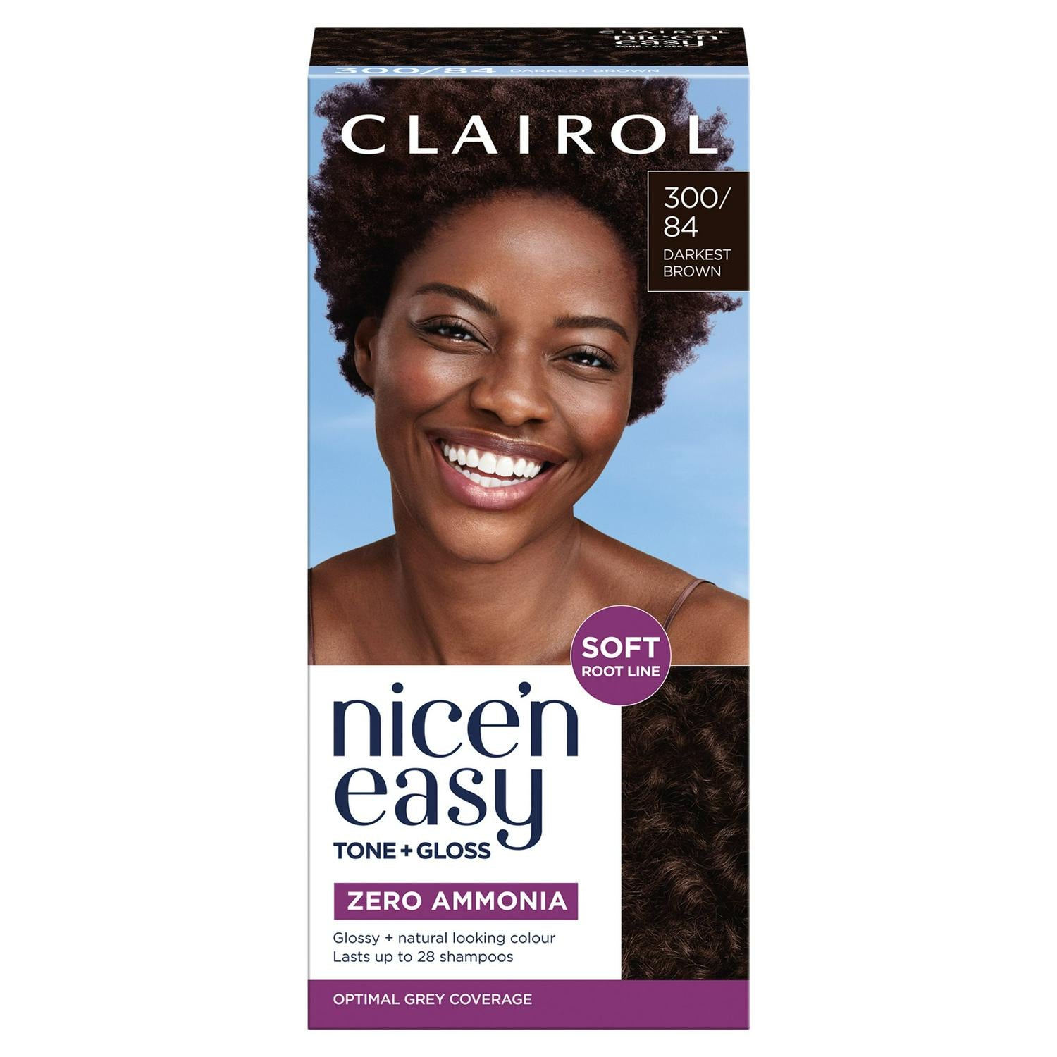 Achieve a glossy, natural-looking colour with Clairol Nice'N Easy Tone+Gloss Darkest Brown 300/84. This semi-permanent dye delivers rich tone enhancement in just 20 minutes. It is formulated without ammonia for a gentler application experience.